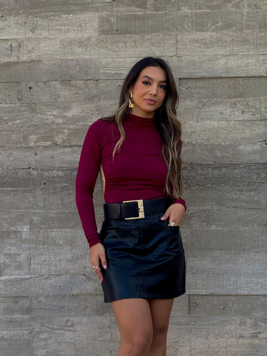 A Saia Ruby é a escolha ideal para quem deseja aliar estilo e praticidade em uma única peça. Confeccionada em couro fake de alta qualidade, ela oferece uma textura sofisticada que destaca o seu look. Com bolsos frontais e passantes para cinto, esta saia combina funcionalidade e um toque moderno, permitindo que você crie diferentes composições.